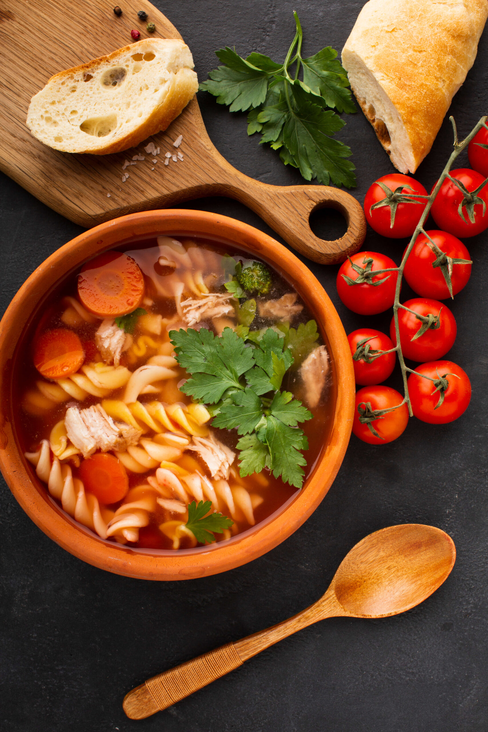 Zupa pomidorowa z ryżem, kotlet mielony drobiowy pieczony, ziemniaki, mizeria, kompot owocowy