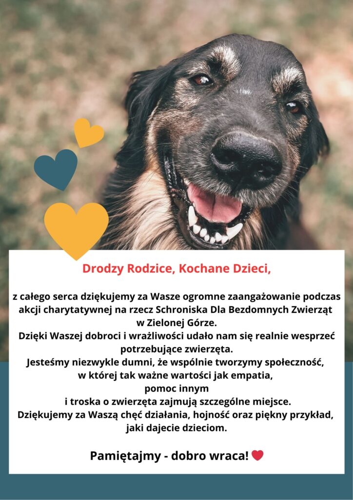 Dzięki ogromnemu zaangażowaniu dzieci, rodziców oraz pracowników przedszkola udało się zebrać wiele potrzebnych darów. Wszystkie rzeczy zostały przekazane do schroniska, gdzie z pewnością pomogą w codziennej opiece nad jego podopiecznymi.